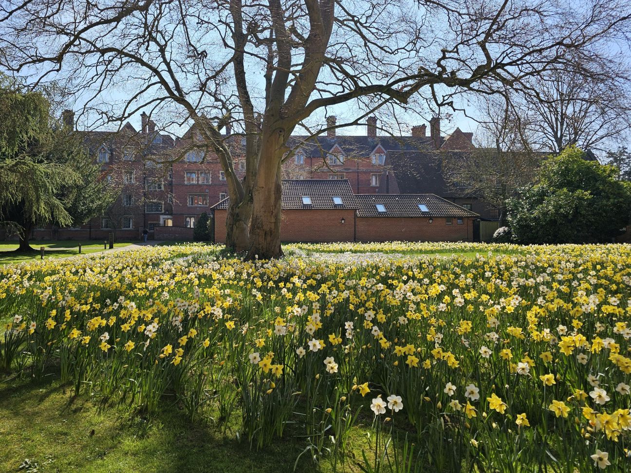 The ground between the Old Library and Ann's Court offered an opportunity for improvement. Until autumn 2024, it was an uneven lawn which was difficult to maintain. Thanks to the Friends of Selwyn Gardens, our gardeners masterminded a transformation, planting 40,000 bulbs including narcissus, tulips, camassia and snowdrops.